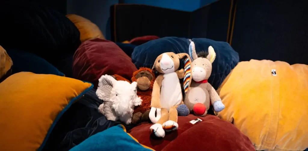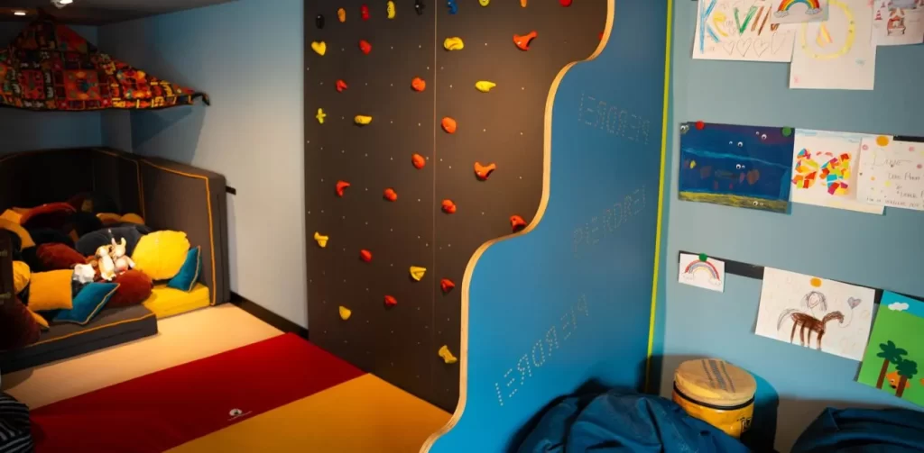 Think of the Racker Room as a mini indoor playground meets imagination station. It’s got climbing nets, crawl spaces, tunnels, reading corners, oversized stuffed animals, and even a little ball pit-style nook made of soft, safe foam pieces. The lighting is warm, the walls are colorful but not retina-searing, and everything feels like it was built by someone who has actually met a child before.